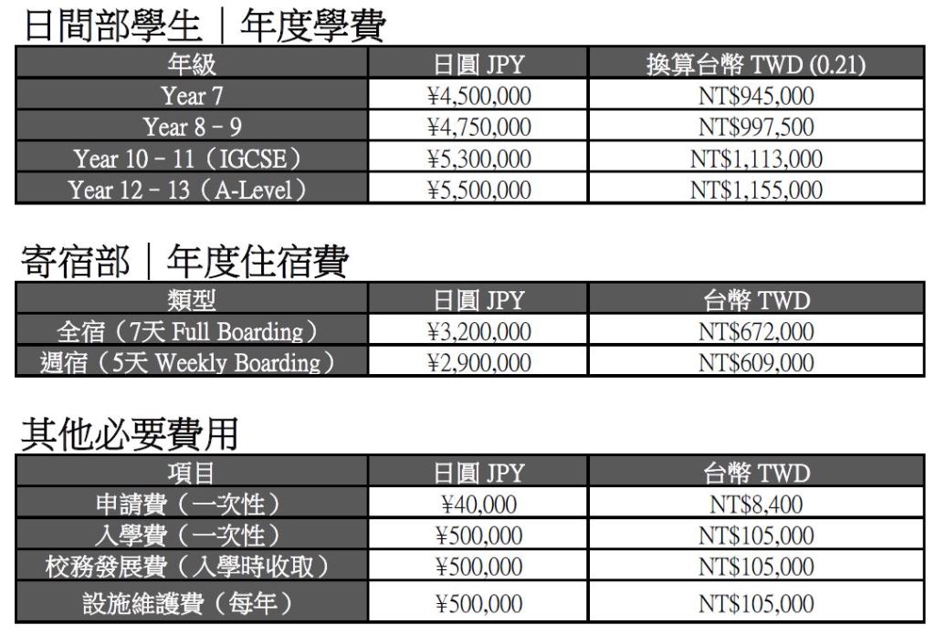 校服費用、英語作為附加語言(EAL) 和特殊教育需求(SEN) 支援、往返學校的交通、日本境外的學校旅行、筆記型電腦、其他電子設備以及其他個人費用
