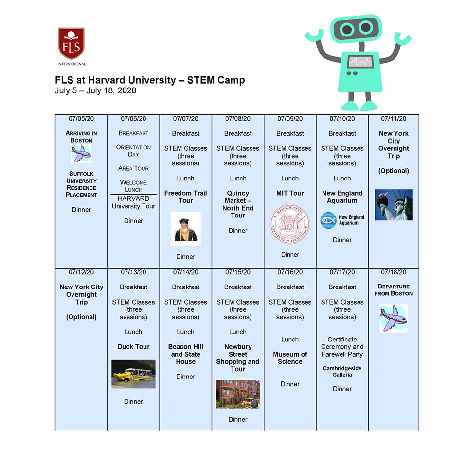 位於劍橋的哈佛大學,是美國最古老、最受尊敬的高等教育學府,也是激勵年輕人在學術上脫穎而出的理想環境。FLS的創新STEM科學營(專注於科學、技術、工程和數學課程)讓學生有機會在這個特殊環境中學習和體驗生動的課程與活動。學生們將會在波士頓市中心享受大學宿舍的住宿,並從具有歷史和教育意義的環境中獲益良多。另外,課程包含參觀許多波士頓著名景點,如:麻省理工學院、科學博物館、新英格蘭水族館等等。