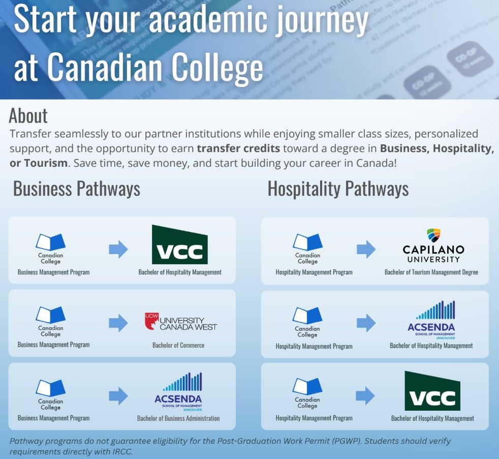 Canadian College → VCC/CU 銜接公立學士(可申請 3 年 PGWP)